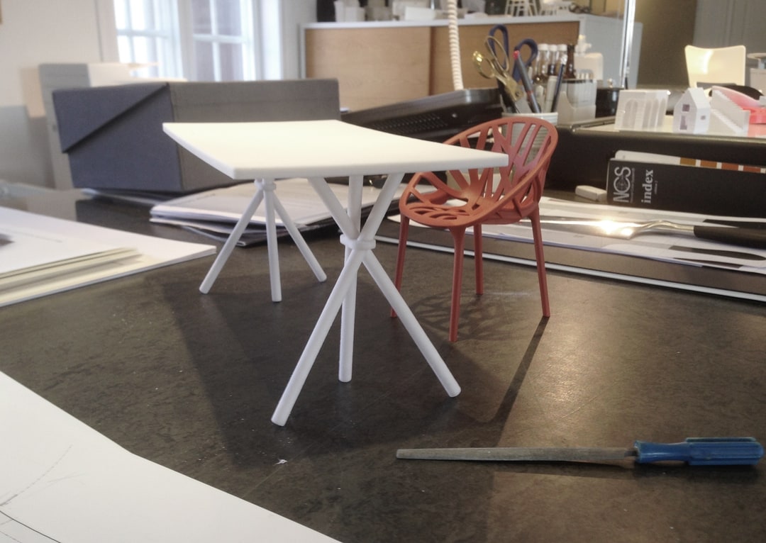 Inspirationen till Bouquet kommer från en bukett med rosor, och likt en bukett möts de i en knut i mitten, för att därifrån med sina raka runda ben skapa sin infästning mot bordsskivan respektive sina givna positioner utmed golvet